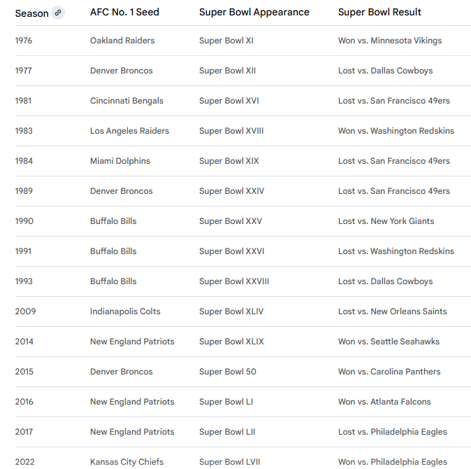 One seed is not all it's cracked up to be. Since 1976 (almost 50 years), fifteen AFC one seeds have gone to SB. Six won.