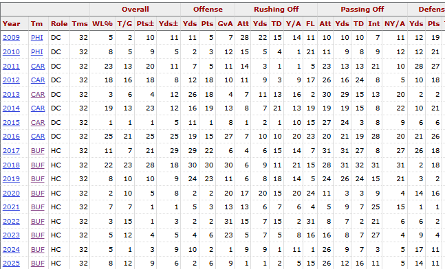 There not a snowball's chance in hell that Saleh would be a viable candidate to replace McDermott: https://www.pro-football-reference.com/coaches/SaleRo0.htm. He has had a few good years on the defensive yards-allowed side for both SF and the Jets, but the points given up are a problem, even in SF, where they finished 25th, 28th, 8th, and 17th in point allowed per game. I know there is the context of the Jets ownership, but I don't see how Pegula could ever successfully sell Saleh to this fanbase given that McDermott's defenses don't give up many points at all. I mean, they are kind of a shitshow this season, but they are STILL 11th in points given up. Since 2019, they have finished 2nd, 16th, 1st, 2nd, 4th, 11th, and 11th. SF's defense this year is 21st in yards allowed and 15th in points. Sure, they have injuries, and that should be taken into account, but so does everyone at this point. -