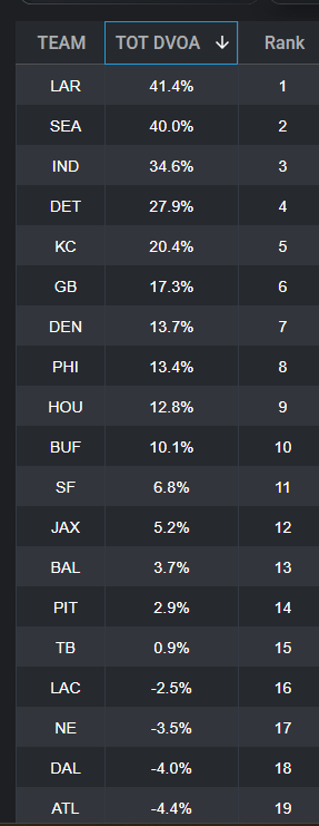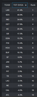 No team survives this much of a delta with DVOA. You seem realistic, this isn't a Super Bowl caliber team. They could keep improving relative to the output that generated these rankings as they're still young. But in all likelihood they're getting bounced in one playoff game. If Buffalo played at New England today we would be favored and I don't think we are even that strong. It would be Buffalo -3 if not -4 on the road.