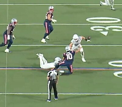 Watching the game live, I felt like Drake Maye's knee might have been down on the 4th quarter play, right before the two minute warning, where he rolled right and hit Diggs for the big yard gain. I have not seen any analysis on it. I am not sure how he could get enough on the ball to complete the throw running that hard right, without hitting the knee to the ground to create whip. Also, the play happened right before the two minute warning. This was the very last play eligible for a challenge by the Bills. When Daquan had him in his grasp, and Maye released the ball, he was 11 yards behind the line of scrimmage. I know it was first down, but I was screaming for a challenge which I know could have likely cost a valuable timeout (w/o the benefit of hindsight). But if he was ruled down, it would have put the Pats in a 2nd and 21. So, do you think it would have been good to challenge the call at that point and do you think he could/should have been ruled down? Sorry I cannot post a link to the play.