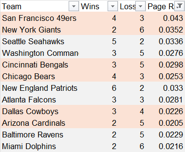 I have back-tested the PageRank model for NFL seasons on both a retrospective and prospective basis. It demonstrates validity as a prospective model, comparable to ELO models. (Of course the retrorespective results are better) There are inflection points that indicate outcomes as close to certain as one encounters in sports. This week, two such opportunities exist: the Rams over the Saints, and the Chargers over the Titans. However, the oddsmakers offer only -1100 odds on the former, which does not represent a value opportunity. The latter, at -500, constitutes a genuine value bet, albeit an unexciting one. So far its 1 for 1, this week with the Ravens over the Dolphins. Actually, the following games do not have a large enough difference in page rank, to actually be expected to have any predictive value.