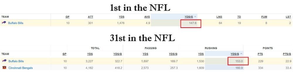 The Bills lead the league in rushing averaging 147.6 yards per game. Great! That seems like a lot! Unfortunately, every single team that plays us suddenly becomes just as good at running the ball as we are & averages 153 rush yards per game... I'm sure we all know our defense has been rough, but has any team won a Super Bowl while allowing teams to shred them on the ground? It's almost surprising that we've only allowed 4 x 100 yard rushers, but most teams have RB by committees or we got ahead on them to where they gave up on the run (like the Jets & Panthers). Even though we have a great RB, our D is such a liability that they all but negate any advantage from our own running game & allow opposing teams to dictate time of possession as much as we do. At this point, we're going to need to find another advantage, and it'll have to be Josh Allen passing the ball to win offensive shoot-outs like last Sunday. I know they're 2 separate sides of the ball & don't directly correlate with each other, but the advantages you expect from being a dominant run team usually benefit your D by allowing them more time to rest & recover. But this D allows every opposing offense to do the same thing, so it all comes back to Allen making plays to win.