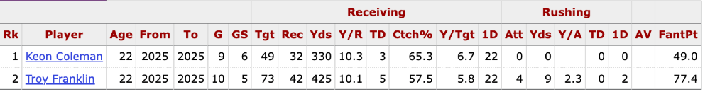You guys are all talking like Troy Franklin has been lighting up the league. He was considered a giant bust last year, when he only had 263 yards in 16 games. His success rate on targets was 35.8%. He's been better this year, but he has yet to have a 100-yard receiving game. He's getting a lot of targets the past few weeks as teams have doubled Sutton, but he still had 4 catches for 27 yards in Houston two weeks ago. I know there have been some highlights that you have seen, but overall, he's a JAG. In fact, Keon Coleman has more yards per target and a better catch percentage. This year! https://www.sports-reference.com/stathead/tiny/AqwZp