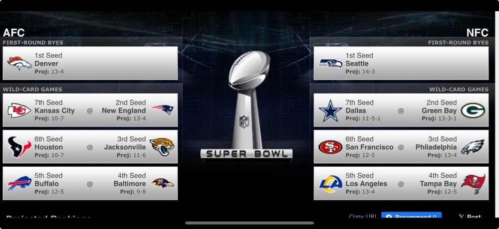 This is what my (likely bad) predictions came up with. I’d take this in a heartbeat. The AFC WCs could all conceivably win and the Bills could potentially host both the division round and AFFCG