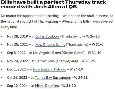 Actually, yes, he is perfect on Thursday night games. 8-0. https://www.buffalorumblings.com/2025/5/15/24430503/the-buffalo-bills-are-a-perfect-7-0-on-tnf-with-josh-allen -