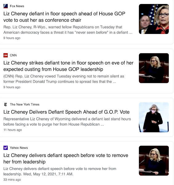 B-Man Posted May 12, 2021 Posted May 12, 2021 It's funny that all the press outlets are choosing the same word, "defiant," when it's not the right word. I understand that the word is often used loosely, just to mean staunch and feisty, but when everyone picks the same loosely applicable word, there's something fishy. But what's fishy? I think it's a desire on the part of the press to imbue Cheney with some sort of righteous entitlement to leadership. They have allegiance to her. They feel defiant. By rights, she ought to lead the Republicans. That's not factually true, of course. I'm spelling this out to expose it as ridiculous. "No one outside of Wyoming, except Peggy Noonan, cares a whit about Liz Cheney. 2