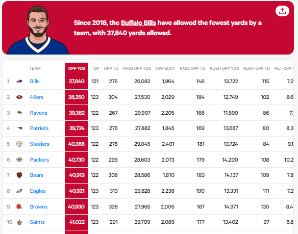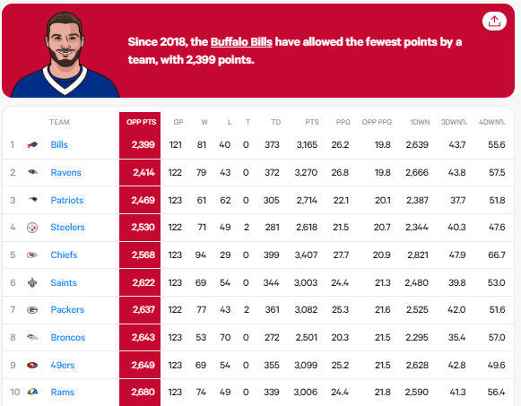 Big Turk Posted 3 hours ago Posted 3 hours ago (edited) You realize the Bills D has allowed the fewest points in the NFL since 2018 when Allen has gotten here right? I mean we can talk about all this, that and the other, but the bottom line is the only thing that matters is how often the other team scores, and the Bills are the best in the NFL over that time in preventing it. The Bills also have allowed the fewest yards in the NFL over that span as well, and BY FAR, the lowest passing yards allowed also. What are we doing? Making up stuff that never happened? Edited 3 hours ago by Big Turk 4 3 2 1 2 Quote