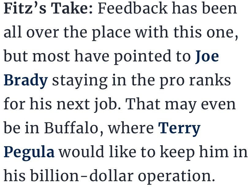 Mat68 Posted 2 hours ago Posted 2 hours ago (edited) Penn State insider published story. Brady’s name has been floated around the last few weeks for the Penn State opening. Rumor is that Brady was getting pushed by Terry Pegula. As a board of trustees member Pegula has some say. I thought this is interesting with respect to the Bills. Mcdermott doesn’t seem as bullet proof. Without Ben Johnson Brady is likely the next hot OC in football. He is getting mixed reviews currently, but if Buffalo moved on from Mcdermott it seems Brady would be Pegula’s preferred choice. I haven’t given much thought about that scenario but it doesn’t seem far fetched. Edited 2 hours ago by Mat68 1 Quote